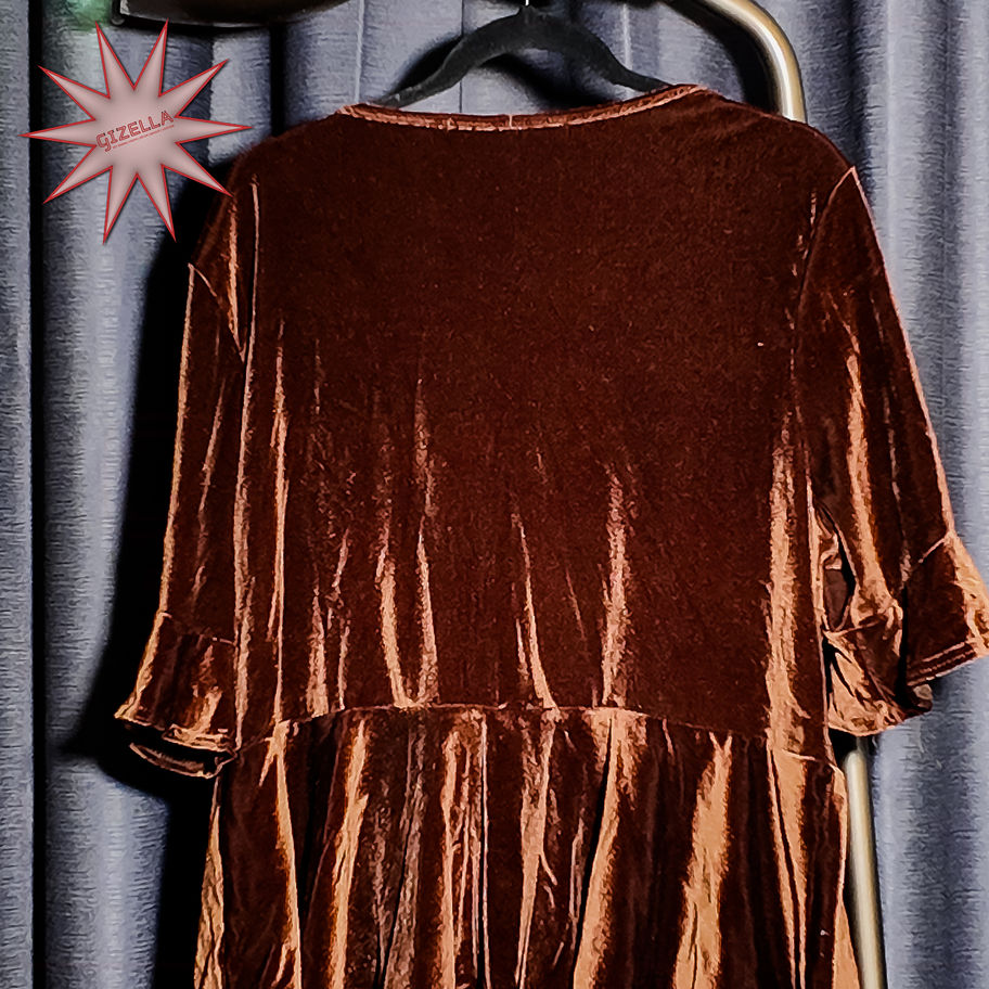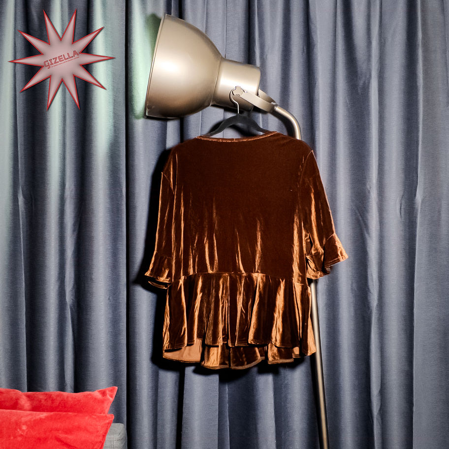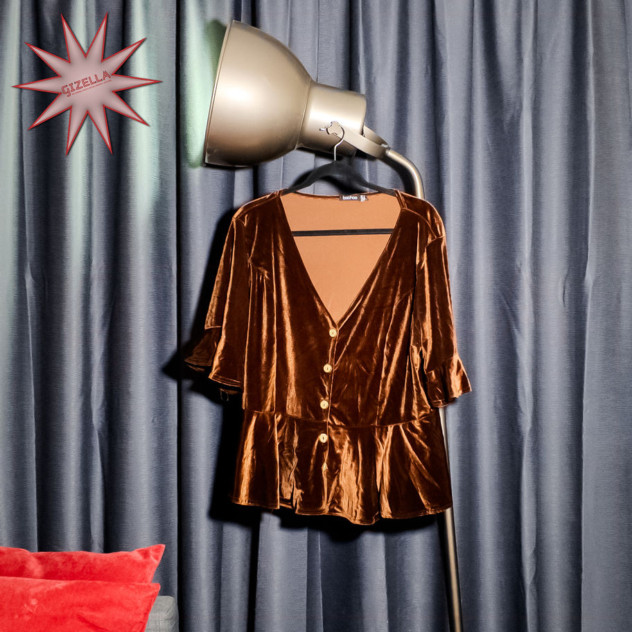 BOOHOO Brown, Velvet Peplum Top – Size UK 20